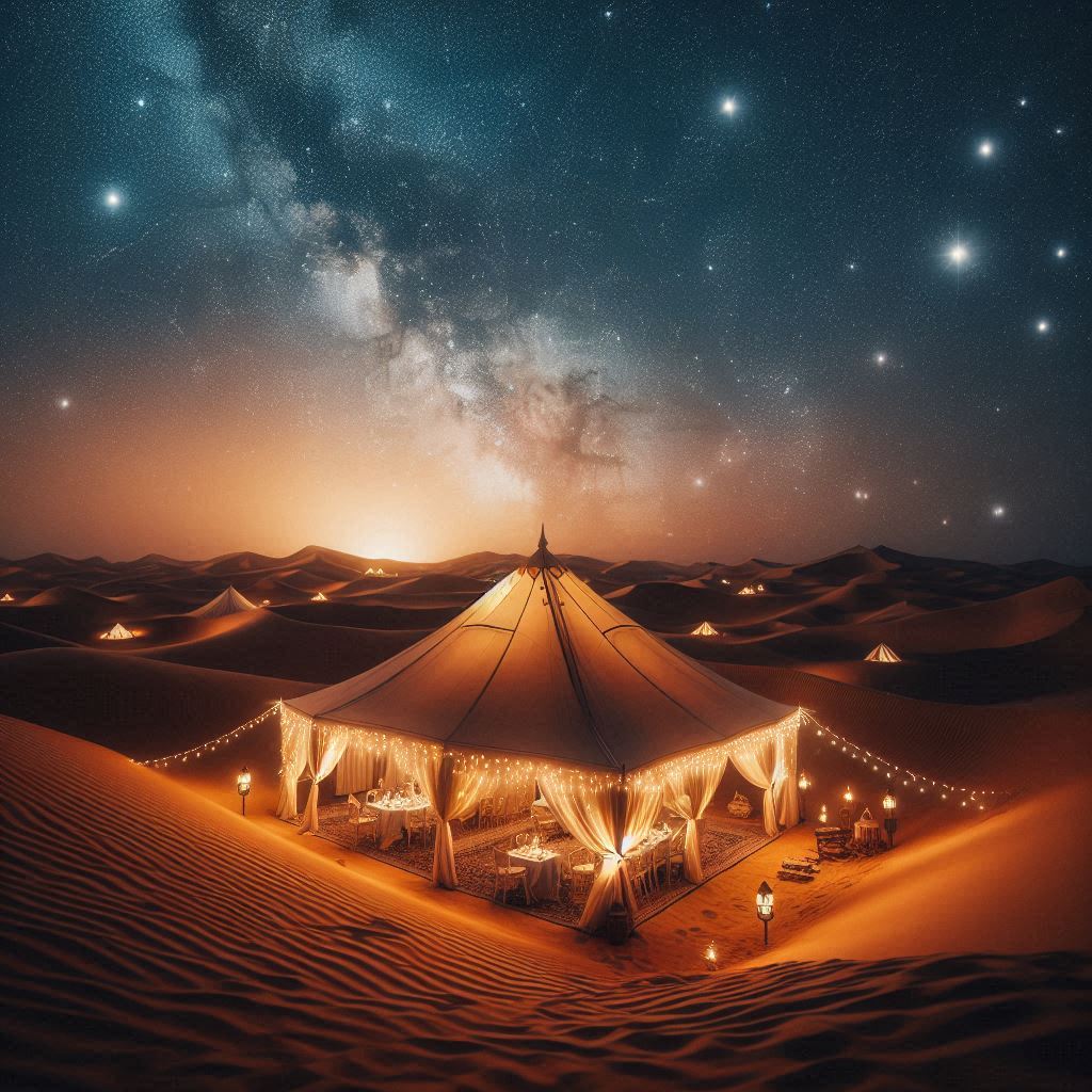 So, picture the vastness of a desert under a blanket of stars. What can you believe would make the most serene and majestic setting for an event? Imagine tents full of fairy lights, traditional Arabian music, fire dancers, and all the ambiance that comprises such an event. All this amidst gourmet experiences and with the timeless beauty of the desert as a backdrop.
